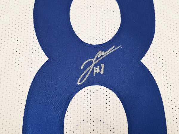 This is a White Jersey that has been hand signed by Jared Verse. This is a custom jersey with no name brand. The approximate size is XL. It has nice sewn in name and numbers. This item has been witnessed and certified authentic by Beckett Authentication (BAS) and comes with their tamper-proof witness hologram.