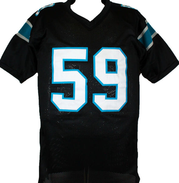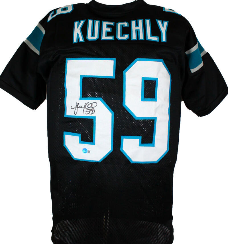 Luke Kuechly Autographed Black Pro Style Jersey-Beckett W Hologram *Black THIS IS NOT AN NFL JERSEY. THIS HAS NO TAGS, NO LOGOS, NO EMBLEMS. This is a Luke Kuechly of the Carolina Panthers hand autographed custom made (non name brand) authentic style (stitched letters and numbers) jersey. This item has a Beckett Witnessed Authentication, which comes with a numbered hologram and a QR code for verification. You can view this item on the Beckett Authentication website and it shows when and where the item was signed. It was signed either at a public autograph appearance or a private signing. This is a stock photo of the item. Although you may not receive this exact item, the item you receive is virtually identical, brand new, and in great shape. Jersey size is XL.
