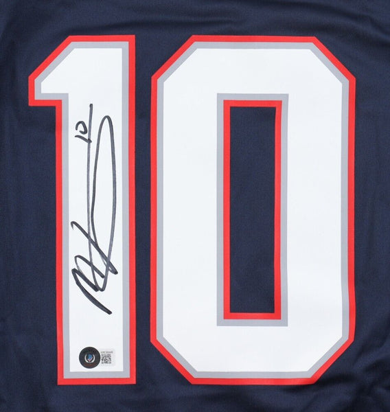 Nike jersey. Everything is printed on, size adult Large or XL. Hand-signed by Mac Jones (New England Patriots).The autograph includes an official Beckett Authentication Services serially numbered hologram for authenticity purposes. The signing of this item was witnessed by Beckett.Authentication: Beckett Hologram