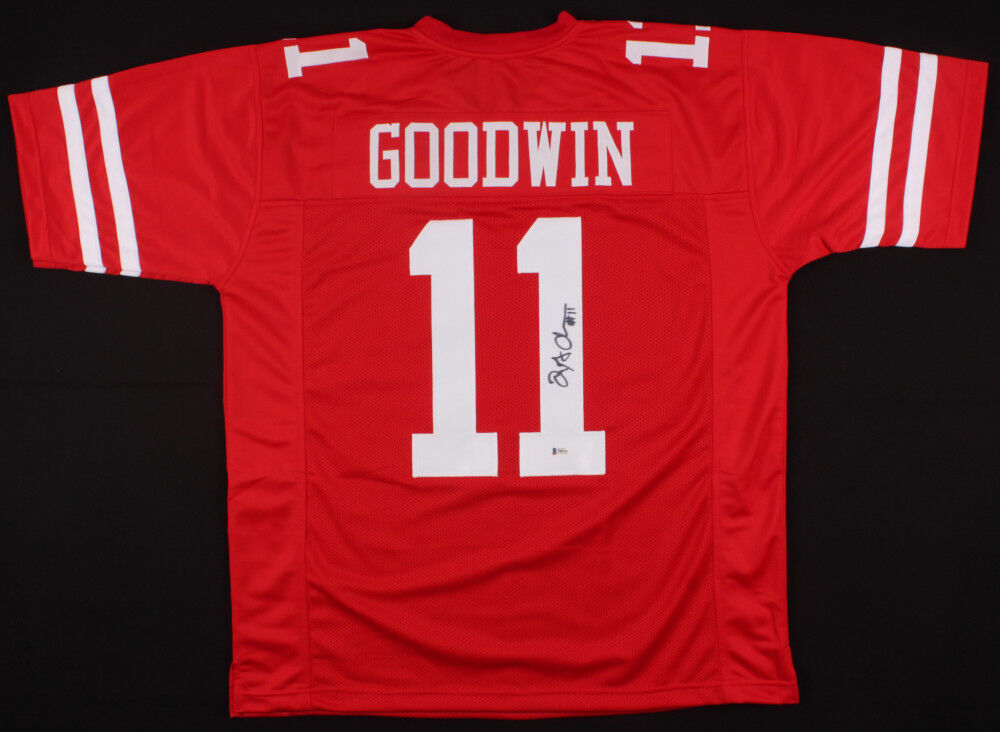 Custom on-field style jersey. Everything is sewn on, size XL. Hand-signed in black felt-tip pen by Marquise Goodwin. The lot / autograph(s) includes an official Beckett Authentication Services serially numbered hologram and matching COA for authenticity purposes.Authentication: Beckett COA