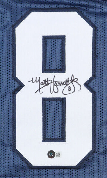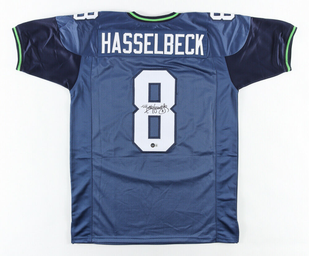 Custom on-field style jersey. Everything is sewn on, size XL. Hand-signed by Matt Hasselbeck.The lot / autograph(s) includes an official Beckett Authentication Services serially-numbered scannable hologram and QR Code card for authenticity purposes. The signing of this item was witnessed by Beckett.Authentication: Beckett Scannable Hologram with QR Code card