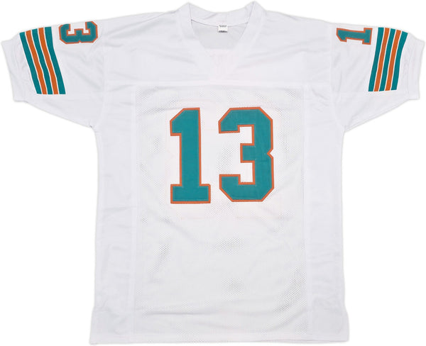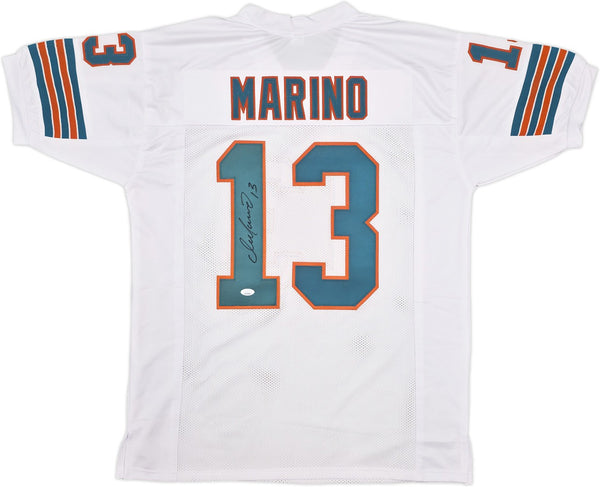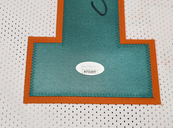 This is a White Jersey that has been hand signed by Dan Marino. This is a custom jersey with no name brand. The approximate size is XL. It has nice sewn in name and numbers. This item has been certified authentic by JSA and comes with their tamper-proof hologram BUT is missing the matching certificate of authenticity.