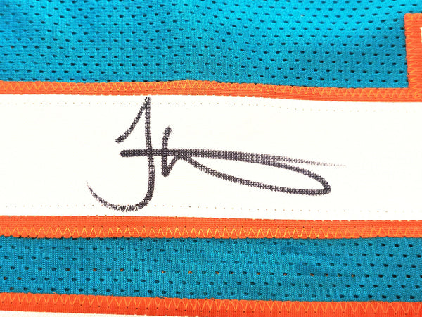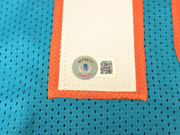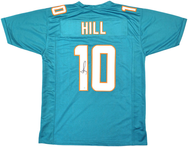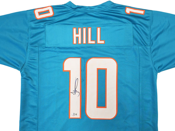 This is a Teal Jersey that has been hand signed by Tyreek Hill. This is a custom jersey with no name brand. The approximate size is XL. It has nice sewn in name and numbers. This item has been witnessed and certified authentic by Beckett Authentication (BAS) and comes with their tamper-proof witness sticker.