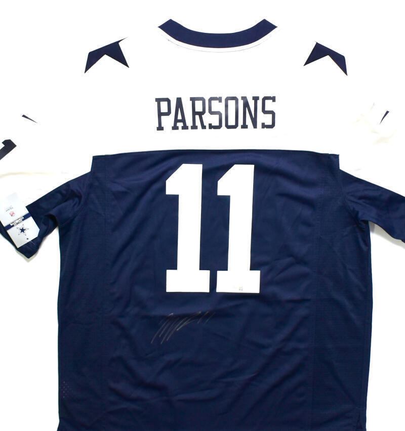 Micah Parsons Autographed Cowboys Blue Alternative Nike Game Jersey-Fanatics *Silver This is a Micah Parsons hand autographed Nike Blue Alternative Game jersey. This item has a Fanatics Authentication, which comes with a Fanatics numbered sticker hologram and a QR code for verification. You can view this item on the Fanatics Authentication website to see it was signed. It was signed either at a public autograph appearance or a private signing. This is a stock photo of the item. Although you may not receive this exact item, the item you receive is virtually identical, brand new, and in great shape. Size XL.