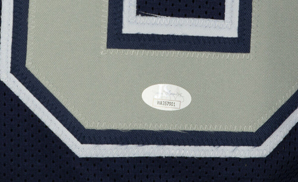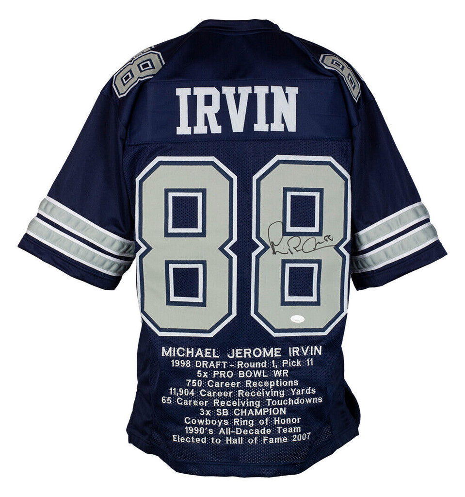 Featured is a Michael Irvin signed custom green pro style stat football jersey. This jersey was hand signed by Michael Irvin and authenticated by JSA authentication services. Included with the jersey is a JSA hologram and certificate of authentication. This jersey would make a great addition to any sports memorabilia collection. This jersey has hand sewn numbers and letter and has NO logos or any affiliation with any manufacturer or team. It is simply intended as an autographed collectible. SPECIFICATIONS Autographed By: Michael Irvin Team: Dallas Cowboys Sport: Football Authentication: James Spence Authentication (JSA)