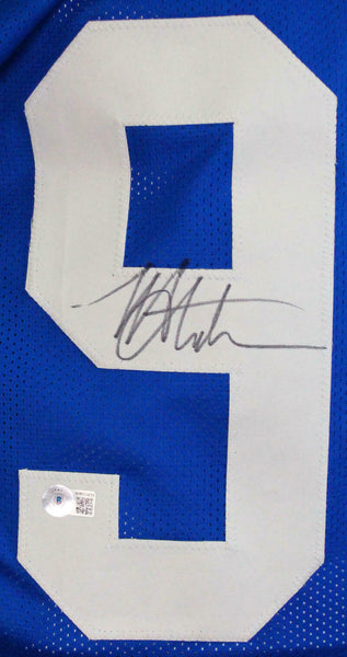 Michael Strahan Autographed Blue STAT Pro Style Jersey-Beckett W Hologram THIS IS NOT AN NFL JERSEY. THIS HAS NO TAGS, NO LOGOS, NO EMBLEMS. This is a hand autograph of Michael Strahan on a Custom Made (non name brand) Authentic STAT Style Jersey with stitched letters and numbers. This item has a Beckett Witnessed Authentication, which comes with a numbered sticker hologram and a generic Beckett Certificate of Authenticity. You can view this item on the Beckett Authentication website. It was signed either at a public autograph appearance or a private signing. This is a stock photo of the item. Although you may not receive this exact item, the item you receive is virtually identical and brand new in great shape. Jersey size is XL.