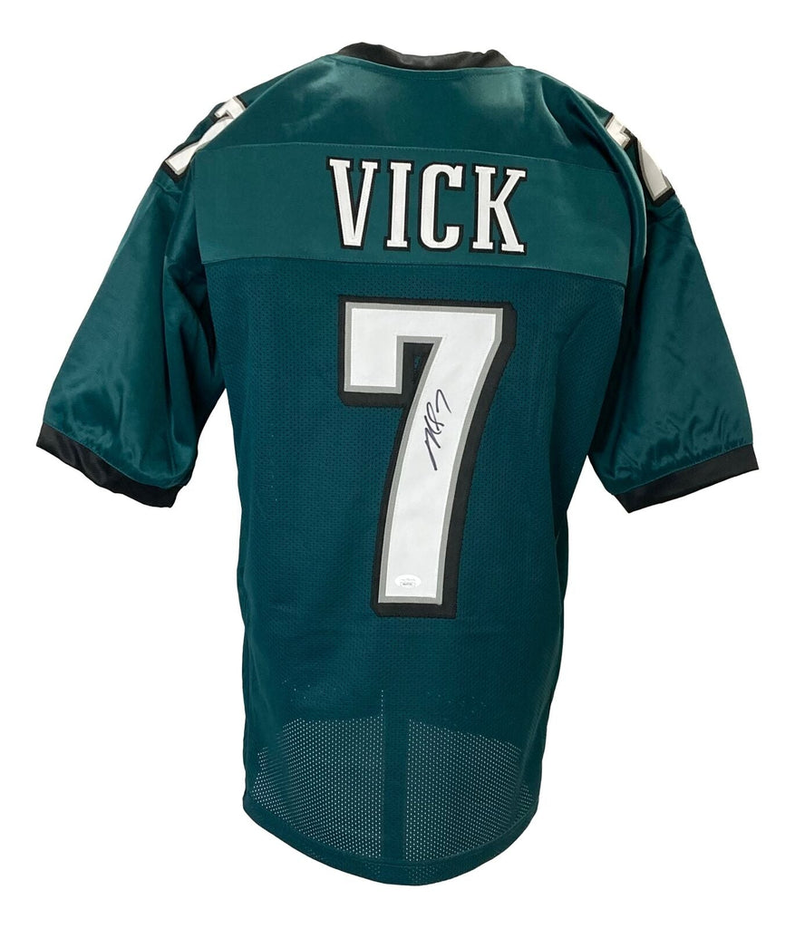 Featured is a Michael Vick signed custom football jersey. This jersey has been hand signed by Vick and comes with the JSA witnessed hologram and certificate of authenticity. This jersey features professionally sewn letters and numbers and is size XL. This jersey has no team tags or emblems and is intended as a sports collectible. SPECIFICATIONS Autographed By: Team: Philadelphia Eagles Sport: Football Authentication: James Spence Authentication (JSA)