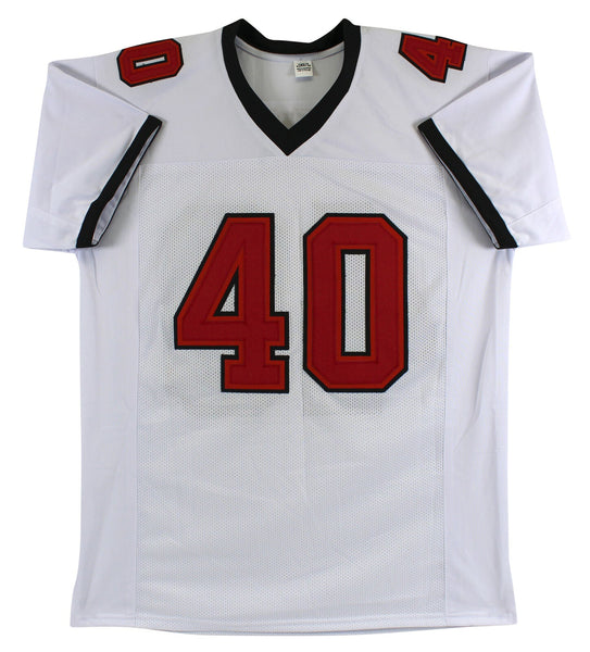 This Autographed White Pro Style Jersey has been Personally Signed by Mike Alstott of the Tampa Bay Buccaneers. This item is 100% Authentic to include a Certificate of Authenticity (COA) / hologram by Beckett Authentication Services. This is a BAS Witnessed Protection Program item which means a Beckett Authentication Service representative was present when this item was being signed. This is a stock item. We conducted an autograph signing with Mike Alstott and we have several of these available. The one you will receive will be of equal quality to the one pictured. This item can be verified through BAS Witnessed. This is a X-Large sized, non-branded, custom-stitched Jersey.
