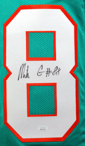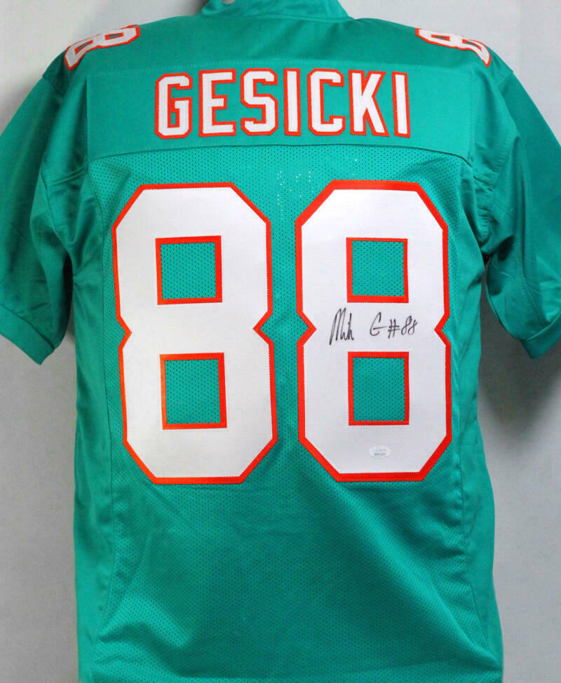 Mike Gesicki #88 Autographed Teal Pro Style Jersey - JSA W Auth *R8 THIS IS NOT AN NFL JERSEY. THIS HAS NO TAGS, NO LOGOS, NO EMBLEMS. This is a hand autograph of Mike Gesicki on a custom made (Non Name Brand) Authentic style Jersey with Stitched Letters and Numbers. This item has a James Spence Witness Protection Authentication, which comes with a JSA numbered sticker and a matching JSA Certificate of Authenticity. You can view this item on the SpenceLOA website and it shows when and where the item was signed. It was signed either at a public autograph appearance or a private signing. This is a stock photo of the item. Although you may not receive this exact item, the item you receive is virtually identical and brand new in great shape. Jersey size is XL.