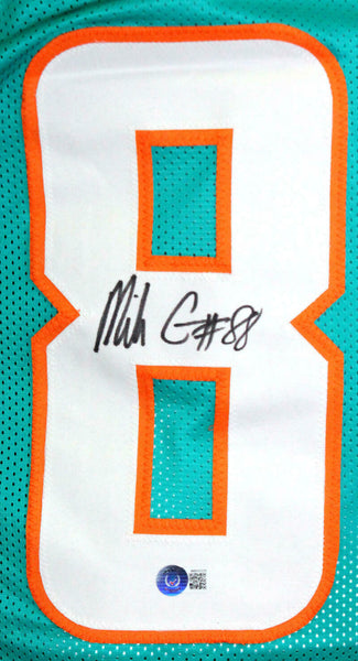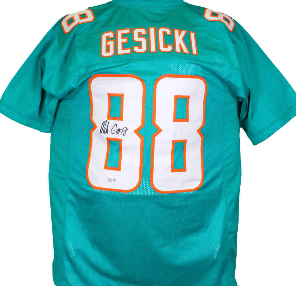 Mike Gesicki Autographed Teal Pro Style Jersey-Beckett W Hologram *Black THIS IS NOT AN NFL JERSEY. THIS HAS NO TAGS, NO LOGOS, NO EMBLEMS. This is a Hand Autograph of Mike Gesicki on a custom made (Non Name Brand) authentic style jersey with stitched letters and numbers. This item has a Beckett Witnessed Authentication, which comes with a Beckett #'ed hologram and a generic Certificate of Authenticity. You can view this item on the Beckett website and it shows when and where the item was signed. It was signed either at a public autograph appearance or a private signing. This is a stock photo of the item. Although you may not receive this exact item, the item you receive is virtually identical and brand new in great shape. Jersey size is XL.