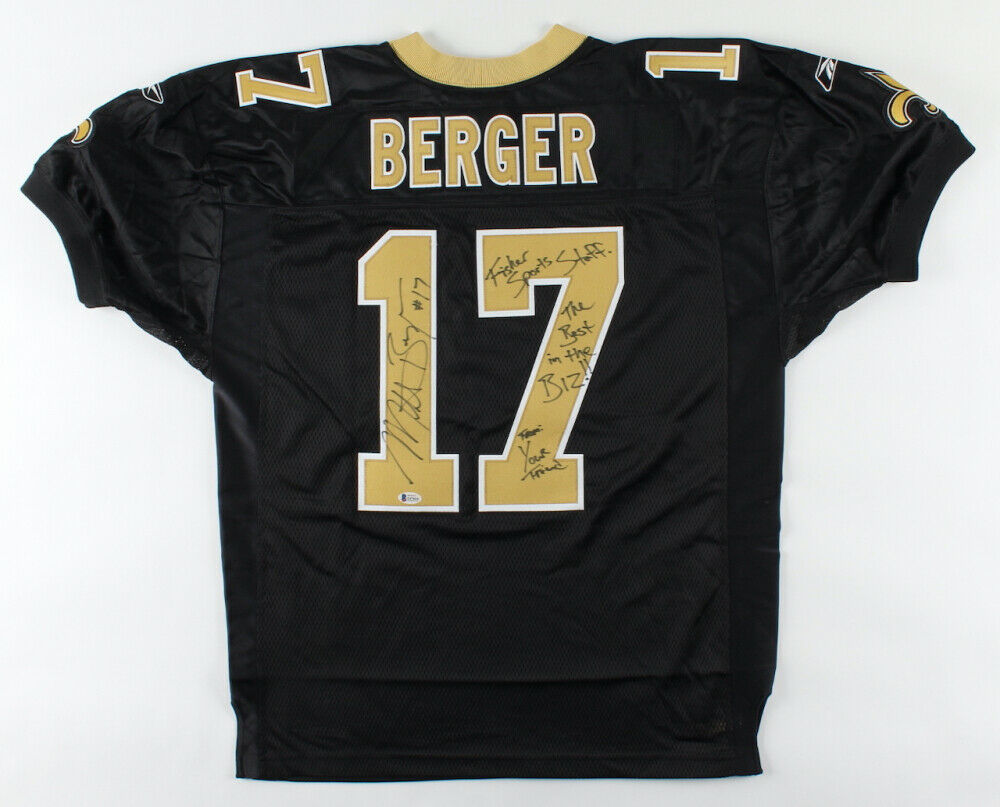 Reebok on-field style jersey. Everything is sewn on, size 50. Has been hand-signed by Mitch Berger (New Orleans Saints). The jersey has been personalized, "Fischer Sports Staff."The lot / autograph(s) includes an official Beckett Authentication Services serially-numbered hologram and matching COA for authenticity purposes.Authentication: Beckett COA