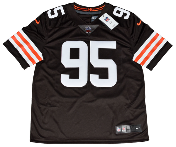Myles Garrett, All-Pro defensive end for the Cleveland Browns, has hand signed this brown Nike Limited jersey at a private signing. Jersey is new with tags attached and all letters/numbers are stitched on. This item is authenticated by Beckett Authentication Services, one of the best authenticators in the industry. Their tamper-evident hologram featuring a QR code and serial number is on the item. The authenticity can be verified online by entering the serial number or scanning the QR code.Item pictured may not be the exact item you will receive. It will be similar quality, and we guarantee your satisfaction.