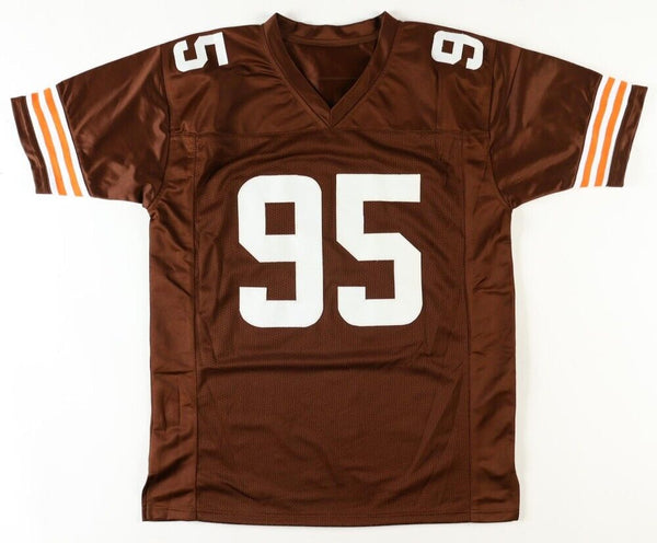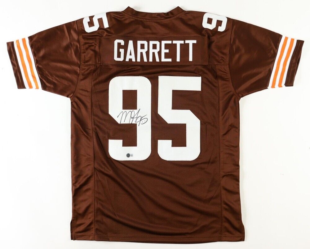 Custom on-field style jersey. Everything is sewn on, size XL. Hand-signed by Myles Garrett.The autograph includes an official Beckett Authentication Services serially numbered hologram and QR Code Card for authenticity purposes. The signing of this item was witnessed by Beckett.Authentication: Beckett Hologram with QR Code Card