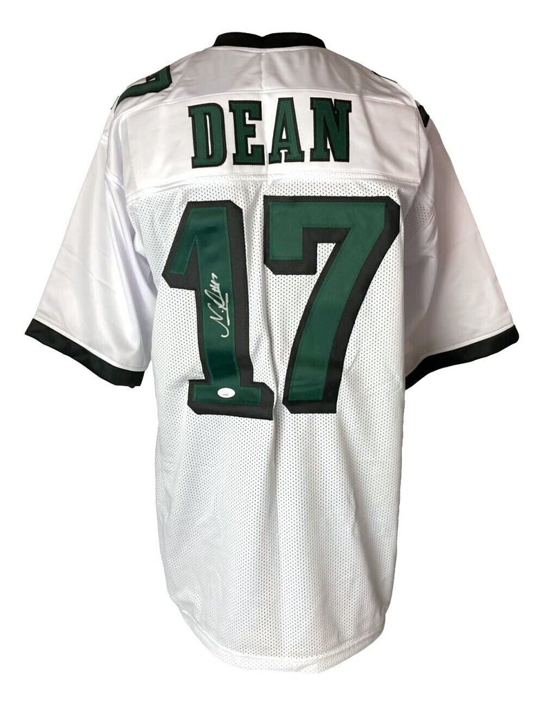 Featured is a Nakobe Dean signed custom football jersey. This jersey has been hand signed by Dean and comes with the JSA hologram. This jersey features professionally sewn letters and numbers and is size XL. This jersey has no team tags or emblems and is intended as a sports collectible. This jersey would make a great addition to any sports memorabilia collection! SPECIFICATIONS Autographed By: Nakobe Dean Team: Philadelphia Eagles Sport: Football Authentication: James Spence Authentication (JSA)