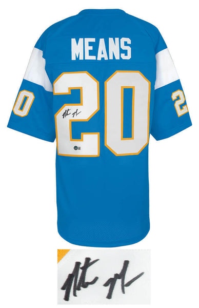 Natrone Means signed powder blue custom football jersey. Jersey has sewn on name and numbers and is size adult X-Large. Item comes with a Beckett Authentication tamper evident numbered sticker and matching Certificate of Authenticity which can be verified online.