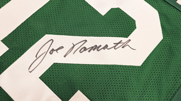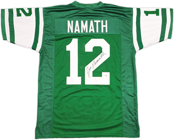 This is a Green Jersey that has been hand signed by Joe Namath. This is a custom jersey with no name brand. The approximate size is XL. It has nice sewn in name and numbers. This item has been witnessed and certified authentic by Beckett Authentication (BAS) and comes with their tamper-proof witness hologram.