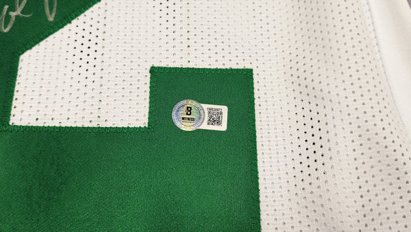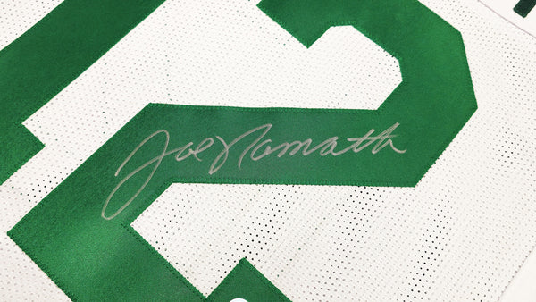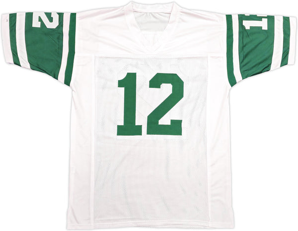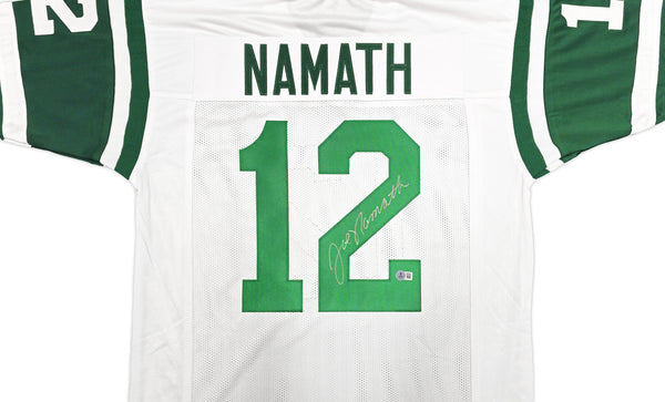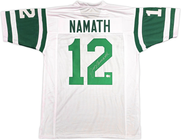 This is a White Jersey that has been hand signed by Joe Namath. This is a custom jersey with no name brand. The approximate size is XL. It has nice sewn in name and numbers. This item has been witnessed and certified authentic by Beckett Authentication (BAS) and comes with their tamper-proof witness hologram.