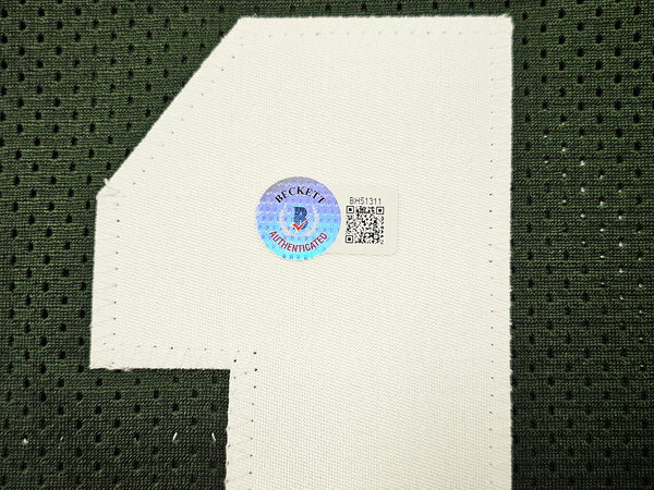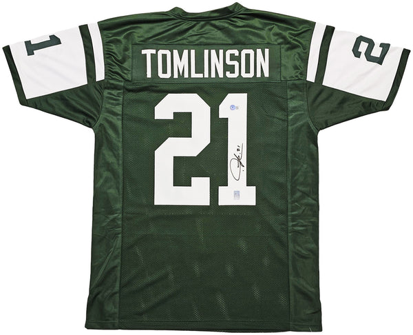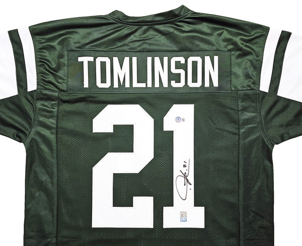 This is a Green Jersey that has been hand signed by LaDainian Tomlinson. This is a custom jersey with no name brand. The approximate size is XL. It has nice sewn in name and numbers. This item has been certified authentic by Beckett Authentication (BAS) and comes with their tamper-proof QR Code hologram.