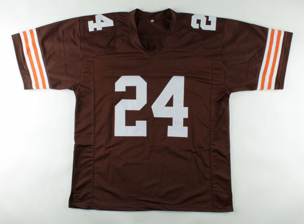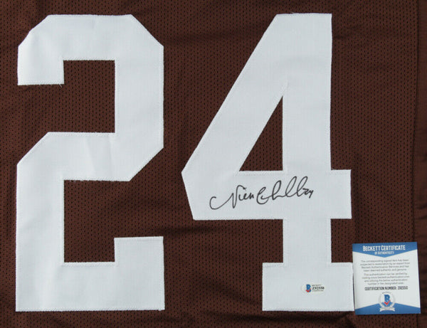 Custom on-field style jersey. Everything is sewn on, size XL. Hand-signed in black felt-tip pen by Nick Chubb. The lot / autograph(s) includes an official Beckett Authentication Services serially numbered hologram and matching COA for authenticity purposes. The signing of this item was witnessed by Beckett.Authentication: Beckett COA