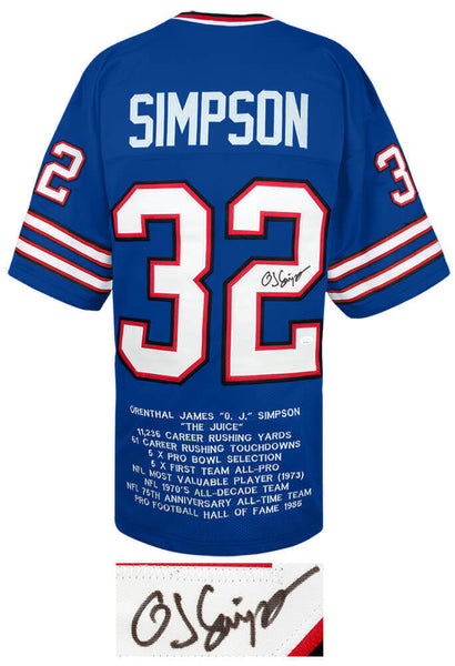 O.J. Simpson signed blue throwback embroidered stat custom football jersey. Item comes with a JSA (James Spence Authentication) tamper evident numbered sticker and matching Certificate of Authenticity which can be verified online. Jersey is size XL.