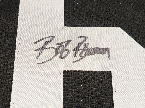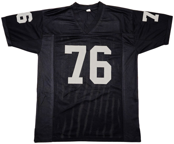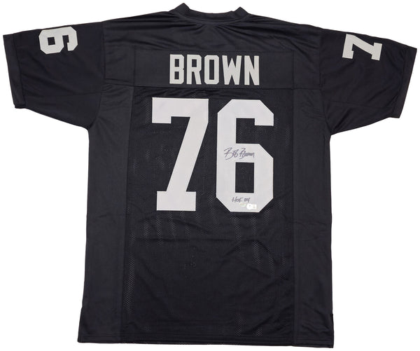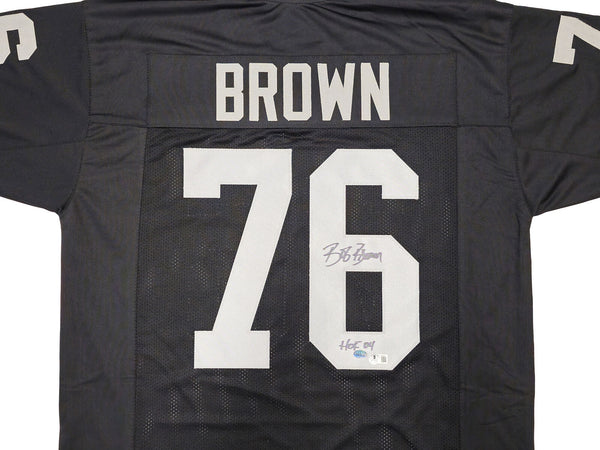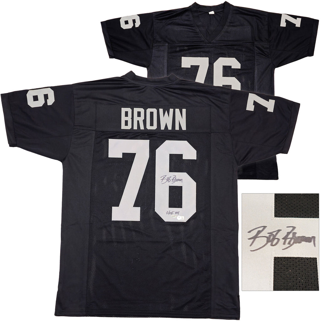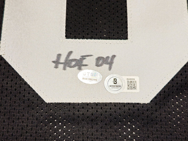 This is a Black Jersey that has been hand signed by Bob Brown. This is a custom jersey with no name brand. The approximate size is XL. It has nice sewn in name and numbers. This item was inscribed "HOF 04." This item has been certified authentic by Beckett Authentication (BAS) and comes with their tamper-proof QR Code sticker that can be verified on beckett-authentication.com.