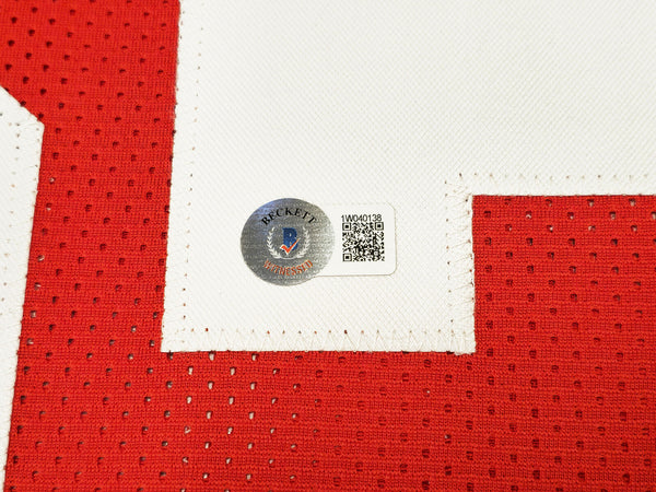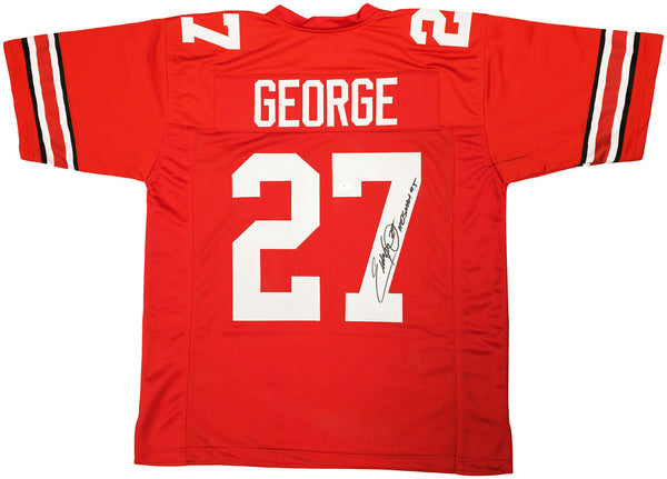 This is a Red Jersey that has been hand signed by Eddie George. This is a custom jersey with no name brand. The approximate size is XL. It has nice sewn in name and numbers. This item was inscribed "Heisman 1995." This item has been witnessed and certified authentic by Beckett Authentication (BAS) and comes with their tamper-proof witness sticker.