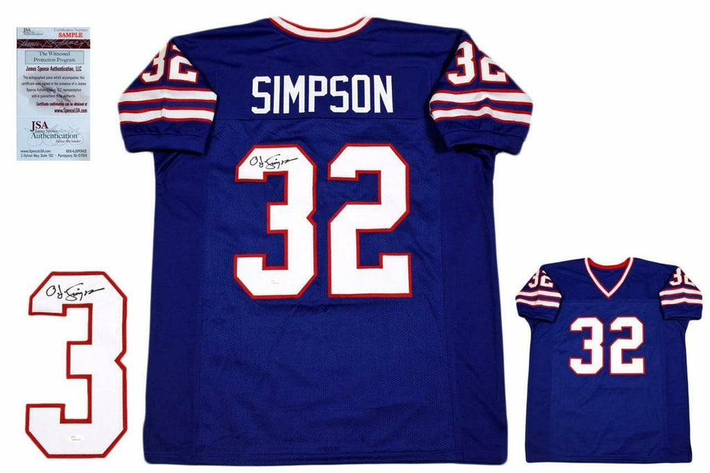 This signed item is brand new without tags or logos. This jersey is custom sewn in a size 52 (XL). All the letters and numbers are sewn on! This item will make a great gift or a great addition to any collection at an AFFORDABLE PRICE! ATHLETE: OJ Simpson ITEM: Custom Sewn Jersey AUTHENTICATION: This item comes with a James Spence Authentication (JSA) Witness Certificate of Authenticity and serial #'ed hologram affixed to the item. To ensure authenticity, the hologram can be reviewed online. This process helps to ensure that the product purchased is authentic and eliminates any possibility of duplication or fraud. This item was signed in the presence JSA representative. NOTE: All of our autographed jerseys are custom jerseys, unless otherwise noted. Our custom jerseys are NON-BRANDED, have NO logos, NO tags, NO patches, NO emblems. All letters and numbers are SEWN-ON. The non-branded jerseys are made specifically for the player(s) to sign, for collectible purposes.