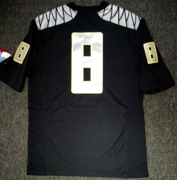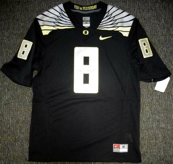 This is a Black Nike Oregon Ducks Jersey that has been hand signed by Marcus Mariota. This one is size Medium. This item has the official tamper-proof Marcus Mariota serial numbered hologram and matching certificate of authenticity.