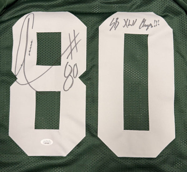 Custom Replica Jersey hand signed by Green Bay Packers All Time Leading wide receiver DONALD DRIVER. The signature is in Black paint pen and includes the inscription "SB XLV Champs". Driver is the franchise record holder in Receptions and Receiving Yards and was a 2017 Packers Hall of Fame inductee! This jersey was signed at a private signing with us and would make a great addition to any Packers collection! This custom jersey is size XL and all letters and numbers are sewn on.This autograph is guaranteed to be 100% authentic and will include a COA from JSA Authentication.