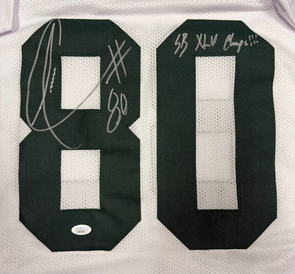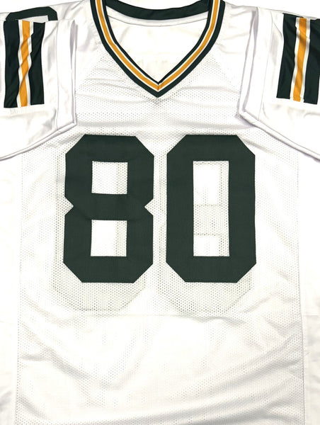 Custom Replica Jersey hand signed by Green Bay Packers All Time Leading wide receiver DONALD DRIVER. The signature is in Silver paint pen and includes the inscription "SB XLV Champs". Driver is the franchise record holder in Receptions and Receiving Yards and was a 2017 Packers Hall of Fame inductee! This jersey was signed at a private signing with us and would make a great addition to any Packers collection! This custom jersey is size XL and all letters and numbers are sewn on.This autograph is guaranteed to be 100% authentic and will include a COA from JSA Authentication.