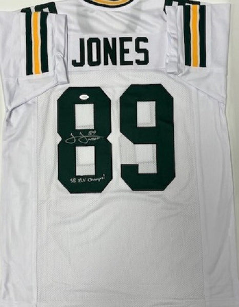 Custom Replica jersey hand signed by Green Bay Packers Super Bowl XLV Champion JAMES JONES. The signature is in Black sharpie with the inscription "SB XLV Champ". This jersey was signed at a public signing with us and would make a great addition to any Packers collection! The jersey size is XL and all letters and numbers are sewn in.This autograph is guaranteed to be 100% authentic and will include a COA hologram from JSA (James Spence Authentication).