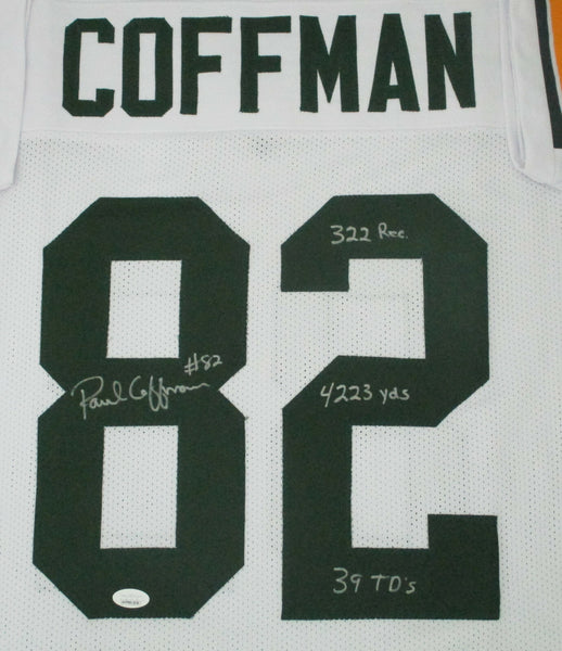 Custom Replica jersey of former Green Bay Packers tight end PAUL COFFMAN. This jersey is signed with Silver paint pen and includes the inscriptions "322 Rec, 4223 Yds, 39 TD's". This jersey has all letters and numbers sewn in. This item was signed at a private signing with us and would make a great addition to any Packers collection. This item is guaranteed to be 100% authentic and will include a COA from JSA authentication.