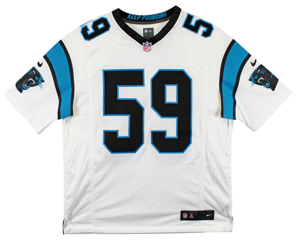 This Autographed White Nike Limited Jersey has been Personally Signed by Luke Kuechly of the Carolina Panthers. This item is 100% Authentic to include a hologram by Beckett Authentication Services. This item will come with an affixed Beckett Authentication Services (BAS) authentication sticker, which includes a scannable QR code to verify authenticity. Please note that Beckett no longer provides serial-numbered COA cards, and the attached BAS sticker will serve as the complete authentication for this item. This is a BAS Witnessed Protection Program item which means a Beckett Authentication Service representative was present when this item was being signed. We conducted an autograph signing with Luke Kuechly where multiples of the same item were signed. While the photographs are representative of this item, the size, placement and strength of the signature may vary. Each item is hand signed, therefore, each autograph is unique. This item can be verified through BAS Witnessed. Multiple sizes available. Reach out for availability.