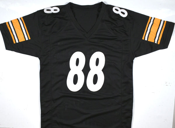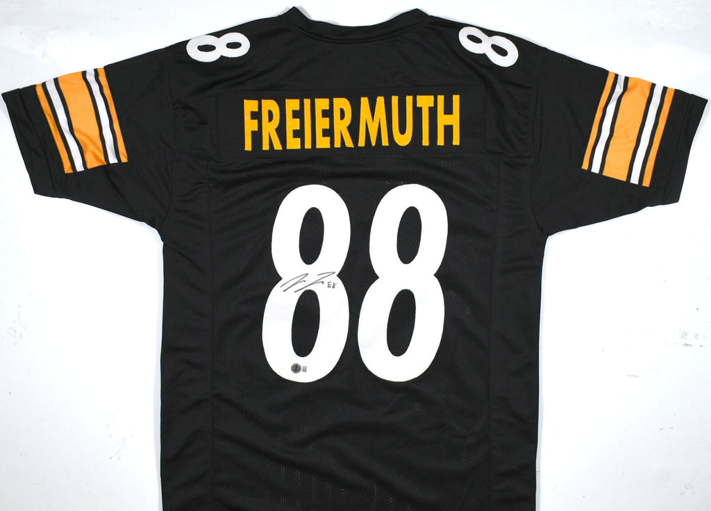 THIS IS NOT AN NFL JERSEY. THIS HAS NO TAGS, NO LOGOS, NO EMBLEMS. This is a Hand Autograph of Pat Freiermuth on a custom made (Non Name Brand) authentic style jersey with stitched letters and numbers. This item has a Beckett Witnessed Authentication, which comes with a Beckett #'ed hologram. You can view this item on the Beckett website and it shows when and where the item was signed. It was signed either at a public autograph appearance or a private signing. This is a stock photo of the item. Although you may not receive this exact item, the item you receive is virtually identical and brand new in great shape. Jersey size is XL. THIS IS NOT AN NFL JERSEY. THIS HAS NO TAGS, NO LOGOS, NO EMBLEMS. This is a Hand Autograph of Pat Freiermuth on a custom made (Non Name Brand) authentic style jersey with stitched letters and numbers. This item has a Beckett Witnessed Authentication, which comes with a Beckett #'ed hologram. You can view this item on the Beckett website and it shows when and where the item was signed. It was signed either at a public autograph appearance or a private signing. This is a stock photo of the item. Although you may not receive this exact item, the item you receive is virtually identical and brand new in great shape. Jersey size is XL.