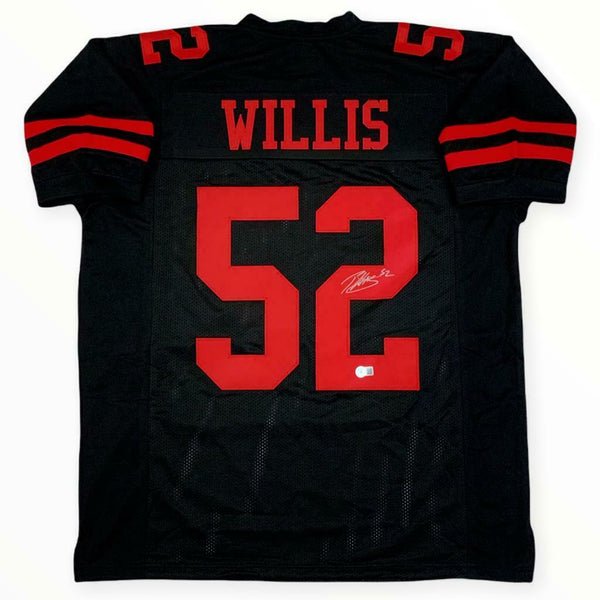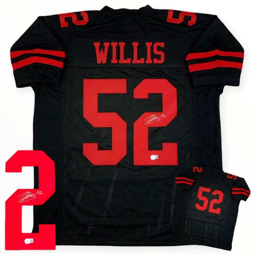 This signed item is brand new without tags or logos. The jersey is custom sewn in a size Large / XL. All the letters and numbers are sewn on! This autographed jersey will make a great gift or a great addition to any collection! ATHLETE: Patrick Willis ITEM: Custom Sewn Jersey AUTHENTICATION: The item comes with a Beckett Authentication Services (BAS) certificate of authenticity and serial #'ed sticker affixed to the item. To ensure authenticity, the serial # can be reviewed online. This process helps to ensure that the product purchased is authentic and eliminates any possibility of duplication or fraud. NOTE: All of our autographed jerseys are custom jerseys, unless otherwise noted. Our custom jerseys are NON-BRANDED, have NO logos, NO tags, NO patches, NO emblems. All letters and numbers are SEWN-ON. The non-branded jerseys are made specifically for the player(s) to sign, for collectible purposes.