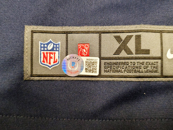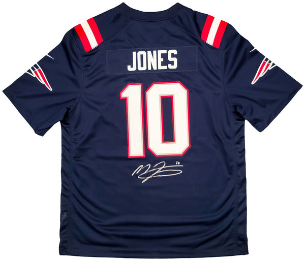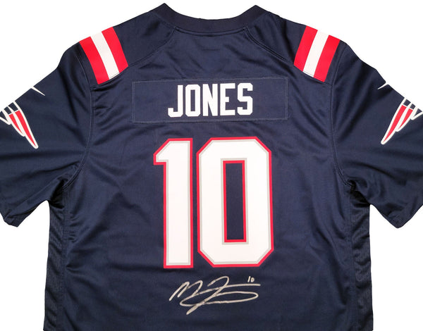 This is a Blue Nike New England Patriots Gameday Jersey that has been hand signed by Mac Jones. This jersey is Size XL. This item has been certified authentic by Beckett Authentication (BAS) and comes with their tamper-proof QR Code sticker that can be verified on the Beckett-authentication.com.