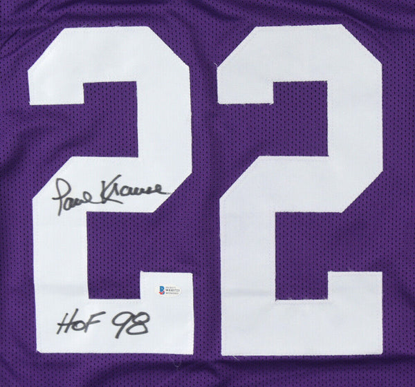 Custom on-field style jersey. Everything is sewn on, size XL. Has been hand-signed and inscribed by Paul Krause (HOF).The lot / autograph(s) includes an official Beckett Authentication Services serially numbered hologram for authenticity purposes. The signing of this item was witnessed by Beckett.Authentication: Beckett Hologram