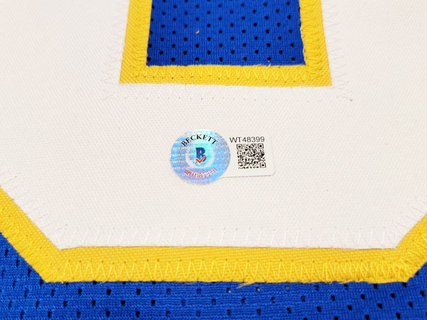 This is a Blue Jersey that has been hand signed by Kenny Pickett. This is a custom jersey with no name brand. The approximate size is XL. It has nice sewn in name and numbers. This item has been certified authentic by Beckett Authentication (BAS) and comes with their tamper-proof QR Code sticker that can be verified on the Beckett-authentication.com.