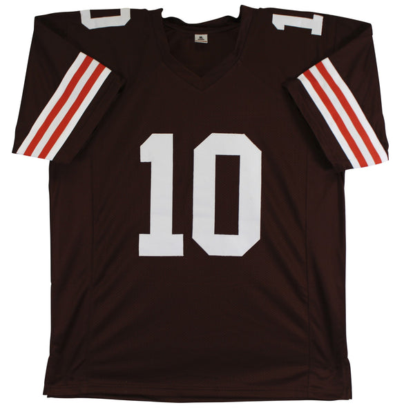 This Autographed Brown Pro Style Jersey has been Personally Signed by Quinshon Judkins of the Cleveland Browns. This item is 100% Authentic to include a hologram by Beckett Authentication Services. This item will come with an affixed Beckett Authentication Services (BAS) authentication sticker, which includes a scannable QR code to verify authenticity. Please note that Beckett no longer provides serial-numbered COA cards, and the attached BAS sticker will serve as the complete authentication for this item. This is a BAS Witnessed Protection Program item which means a Beckett Authentication Service representative was present when this item was being signed. We conducted an autograph signing with Quinshon Judkins where multiples of the same item were signed. While the photographs are representative of this item, the size, placement and strength of the signature may vary. Each item is hand signed, therefore, each autograph is unique. This item can be verified through BAS Witnessed. This is a X-Large sized, non-branded, custom-stitched Jersey.