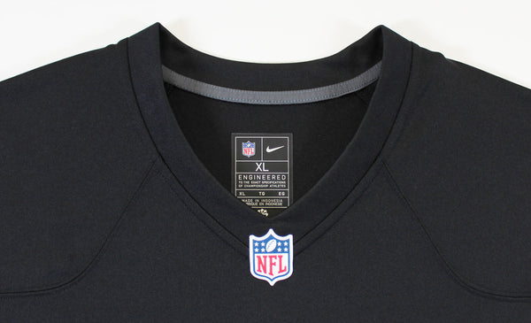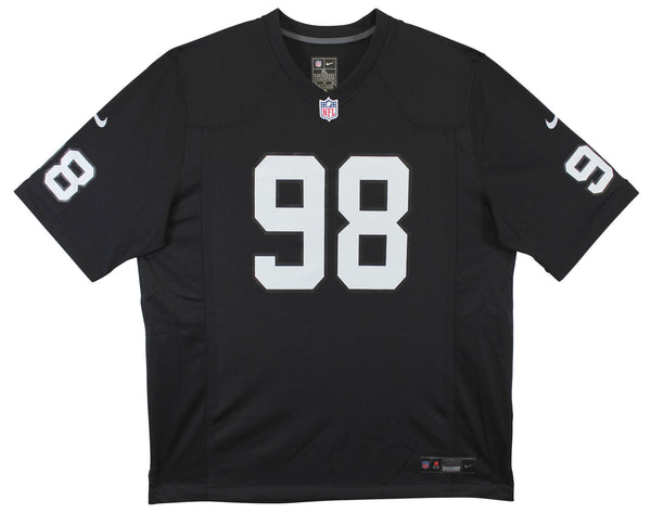 This Autographed Black Nike Game Jersey has been Personally Signed by Maxx Crosby of the Las Vegas Raiders. This item is 100% Authentic to includes a numbered hologram by Fanatics. We conducted an autograph signing with Maxx Crosby where multiples of the same item were signed. While the photographs are representative of this item, the size, placement and strength of the signature may vary. Each item is hand signed, therefore, each autograph is unique. This item can be verified through Fanatics. This is a X-Large sized Jersey.