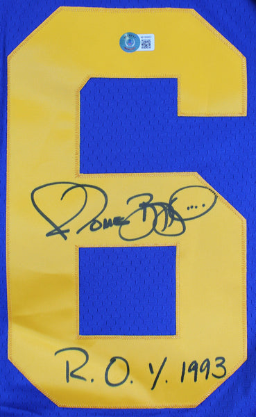 This Autographed Blue Mitchell & Ness Jersey with the inscription of "ROY 93" has been Personally Signed by Jerome Bettis of the Los Angeles Rams. This item is 100% Authentic to include a hologram by Beckett Authentication Services. This item will come with the new Beckett Authentication hologram that has a scannable QR code rather than the traditional COA. If you would like to have a COA, you are welcome to reach out to Beckett for a printed certification once you receive your item. This is a BAS Witnessed Protection Program item which means a Beckett Authentication Service representative was present when this item was being signed. We conducted an autograph signing with Jerome Bettis where multiples of the same item were signed. While the photographs are representative of this item, the size, placement and strength of the signature may vary. Each item is hand signed, therefore, each autograph is unique. This item can be verified through BAS Witnessed. This is a X-Large sized Jersey.
