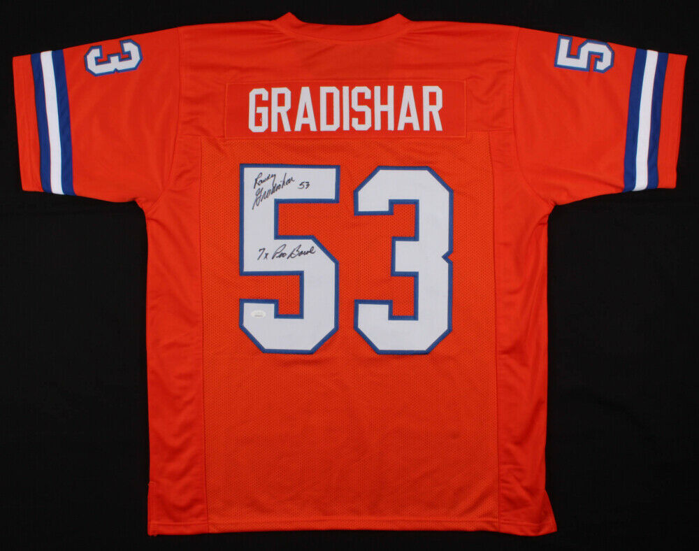 Custom on-field style jersey. Everything is sewn on, size XL. Hand-signed in black paint pen by Randy Gradishar. The autograph includes an official James Spence Authentication (JSA) hologram and matching COA for authenticity purposes. The signing of this item was witnessed by JSA.Authentication: JSA COA