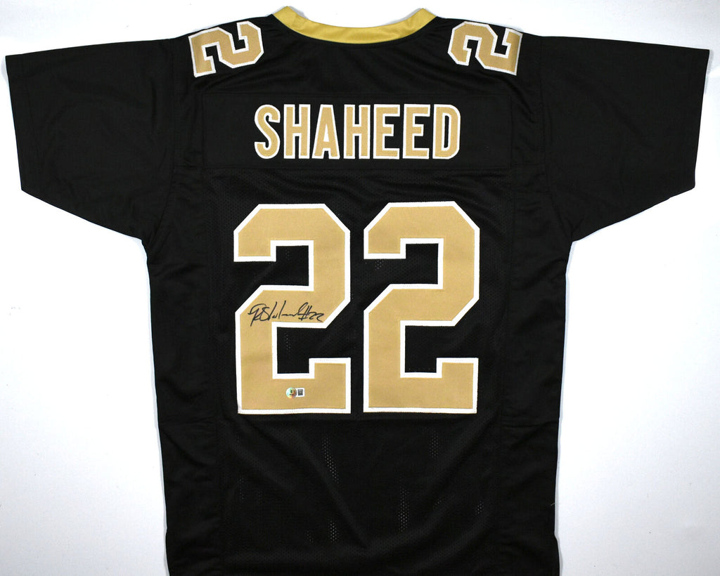 THIS IS NOT AN NFL JERSEY. THIS HAS NO TAGS, NO LOGOS, NO EMBLEMS. This is a hand autograph of Rashid Shaheed on a Custom Made (non name brand) Authentic Style Jersey with stitched letters and numbers. This item has a Beckett Witnessed Authentication, which comes with a Beckett numbered sticker hologram and a QR Code for verification. You can view this item on the Beckett Authentication website and it shows when and where the item was signed. It was signed either at a public autograph appearance or a private signing. This is a stock photo of the item. Although you may not receive this exact item, the item you receive is virtually identical and brand new in great shape. Jersey size is XL. THIS IS NOT AN NFL JERSEY. THIS HAS NO TAGS, NO LOGOS, NO EMBLEMS. This is a hand autograph of Rashid Shaheed on a Custom Made (non name brand) Authentic Style Jersey with stitched letters and numbers. This item has a Beckett Witnessed Authentication, which comes with a Beckett numbered sticker hologram and a QR Code for verification. You can view this item on the Beckett Authentication website and it shows when and where the item was signed. It was signed either at a public autograph appearance or a private signing. This is a stock photo of the item. Although you may not receive this exact item, the item you receive is virtually identical and brand new in great shape. Jersey size is XL.