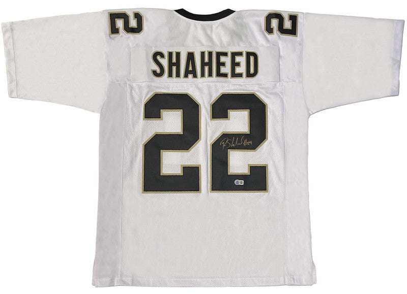 This custom white jersey has been hand signed by Rashid Shaheed, wide receiver for the New Orleans Saints. It comes with an individually numbered, tamper-evident hologram from Beckett Authentic. To ensure authenticity, the hologram can be reviewed online. This process helps to ensure that the product purchased is authentic and eliminates any possibility of duplication or fraud.Rashid Shaheed is the newest exclusive athlete to the Super Sports Center family.