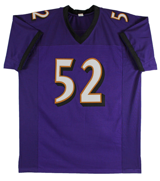 This Autographed Purple Pro Style Embroidered Stat Jersey has been Personally Signed by Ray Lewis of the Baltimore Ravens. This item is 100% Authentic to include a hologram by Beckett Authentication Services. This item will come with the new Beckett Authentication hologram that has a scannable QR code rather than the traditional COA. If you would like to have a COA, you are welcome to reach out to Beckett for a printed certification once you receive your item. This is a BAS Witnessed Protection Program item which means a Beckett Authentication Service representative was present when this item was being signed. We conducted an autograph signing with Ray Lewis where multiples of the same item were signed. While the photographs are representative of this item, the size, placement and strength of the signature may vary. Each item is hand signed, therefore, each autograph is unique. This item can be verified through BAS Witnessed. This is a X-Large sized, non-branded, custom-stitched Jersey.