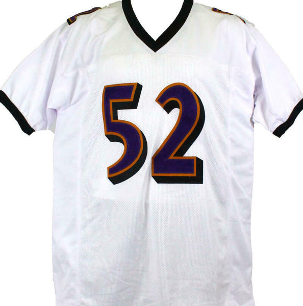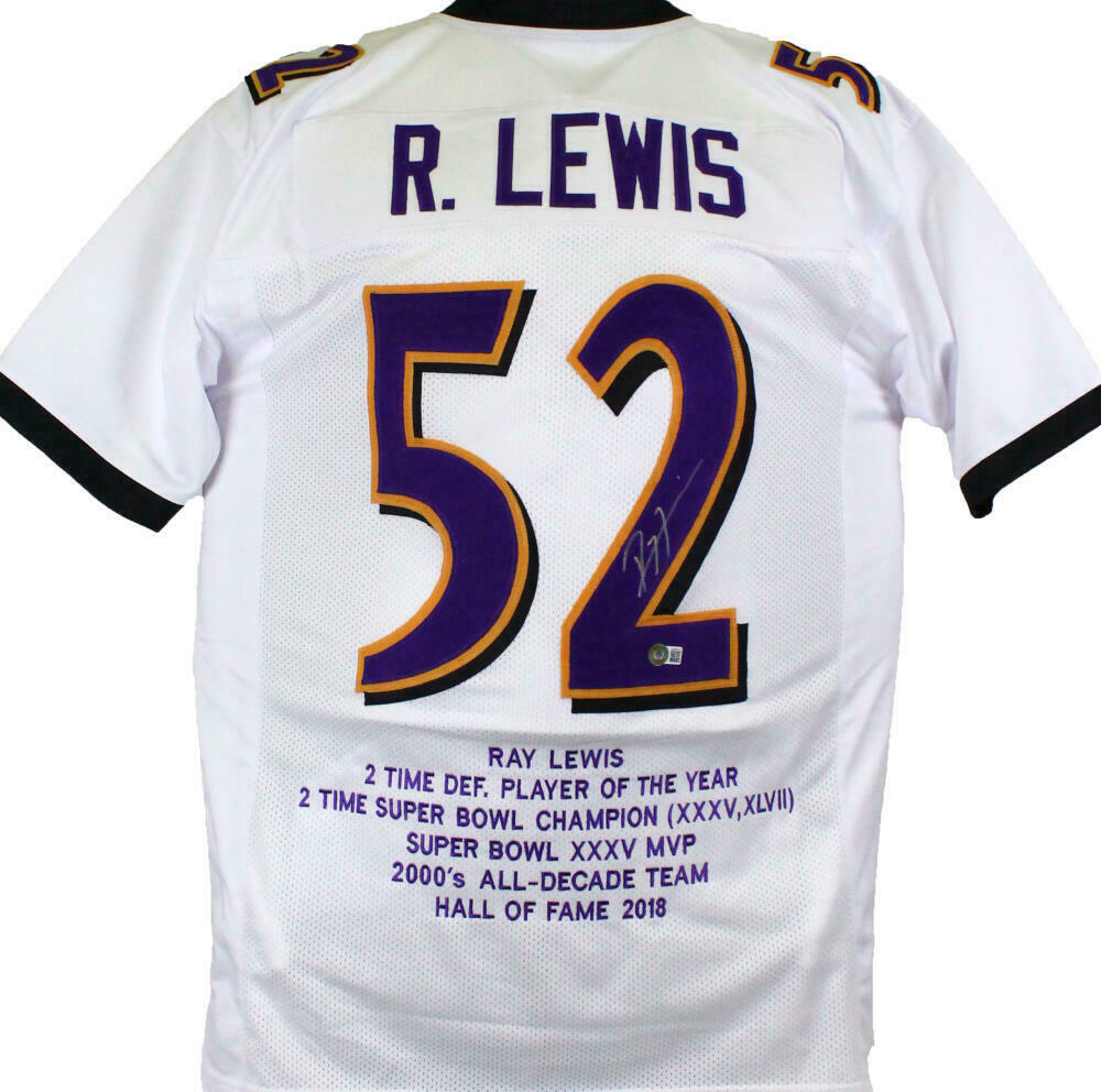 Ray Lewis Autographed White Pro Style STAT Jersey-Beckett W Hologram *Silver THIS IS NOT AN NFL JERSEY. THIS HAS NO TAGS, NO LOGOS, NO EMBLEMS. This is a hand autograph of Ray Lewis on a Custom Made (non name brand) Authentic Style STAT Jersey with stitched letters and numbers. This item has a Beckett Witnessed Authentication, which comes with a numbered hologram and a QR code verfication. You can view this item on the Beckett Authentication website. It was signed either at a public autograph appearance or a private signing. This is a stock photo of the item. Although you may not receive this exact item, the item you receive is virtually identical and brand new in great shape. Jersey size is XL.