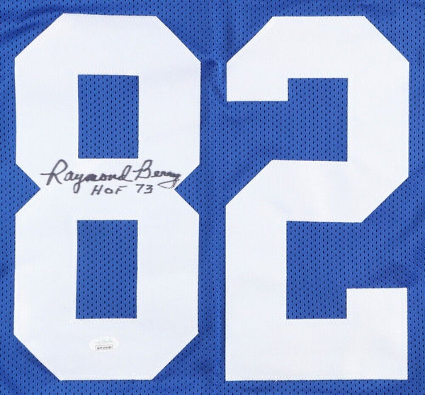 Custom on-field style jersey. Everything is sewn on, size XL. Hand-signed and inscribed by Raymond Berry (HOF).The lot / autograph(s) includes an official James Spence Authentication (JSA) hologram and matching COA for authenticity purposes. The signing of this item was witnessed by JSA.Authentication: JSA COA