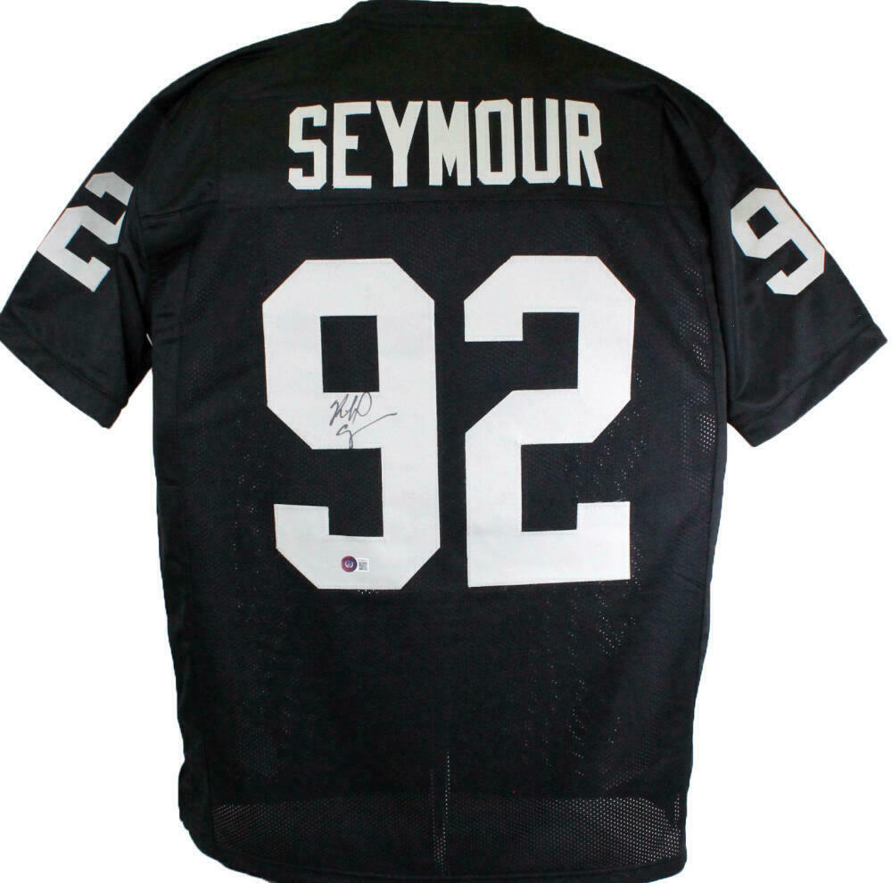 Richard Seymour Autographed Black Pro Style Jersey - Beckett W *Black THIS IS NOT AN NFL JERSEY. THIS HAS NO TAGS, NO LOGOS, NO EMBLEMS. This is a Richard Seymour signature on a custom made (non name brand) authentic style (stitched letters and numbers) jersey. This item has a Beckett Witnessed Authentication, which comes with a numbered and a matching Beckett Certificate of Authenticity. You can view this item on the Beckett Authentication website. It was signed either at a public autograph appearance or a private signing. This is a stock photo of the item. Although you may not receive this exact item, the item you receive is virtually identical, brand new, and in great shape. Jersey size is XL.
