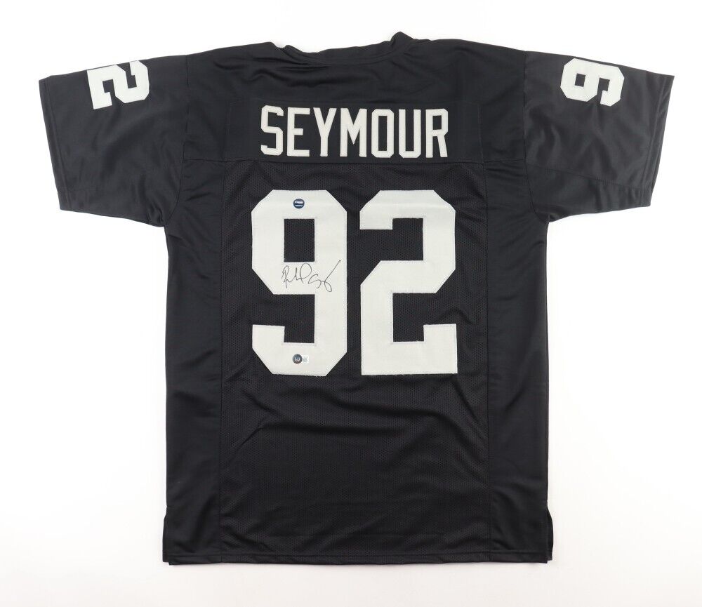 Custom on-field style jersey. Everything sewn on, size XL. Hand signed by Richard Seymour (HOF). The lot / autograph(s) includes an official Beckett Authentication Services serially numbered hologram for authenticity purposes.Authentication: Beckett Hologram