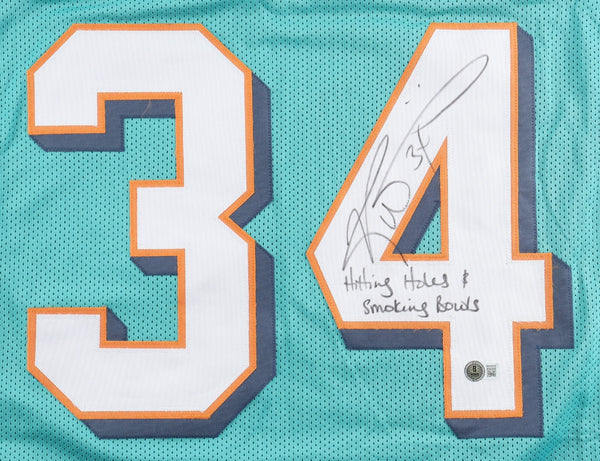 Custom on-field style jersey. Everything is sewn on, size XL. Hand-signed and inscribed by Ricky Williams.Former NFL running back Ricky Williams is launching his own cannabis lifestyle brand, Highsman - a play on words with the Heisman award he received in 1998, after years advocating for the legalization and normalization of cannabis use.The athlete-focused, purpose-driven brand features cannabis products, apparel and accessories curated by Williams himself. The initial cannabis lineup features three strains: sativa, an indica and a hybrid. The company will also launch its own pre-rolls soon."We are flipping the script on how people view cannabis," Williams said in an exclusive interview.Throughout his professional football career, Williams faced two suspensions for marijuana. And he assures, cannabis helped him deal with the stress and injuries that come with the job - while never hindering his success. The autograph includes an official Beckett Authentication Services serially-numbered scannable hologram and QR Code card for authenticity purposes. The signing of this item was witnessed by Beckett.Authentication: Beckett Scannable Hologram with QR Code card